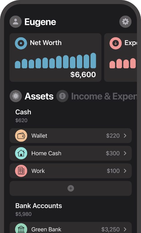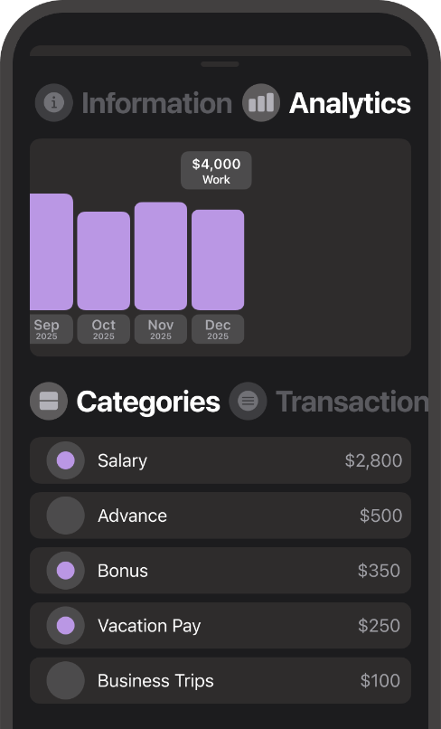 Track expenses by type and category — from daily purchases to major payments. Analyze spending patterns and see where your money goes.