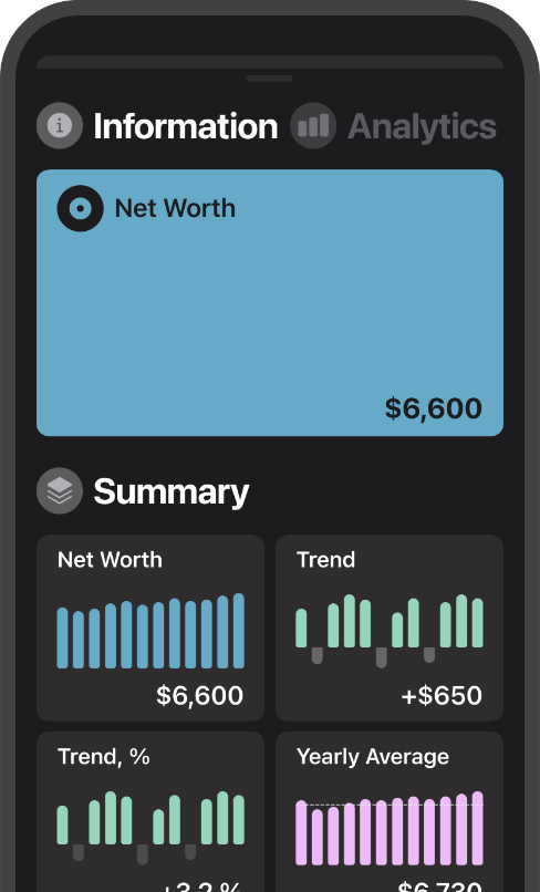 Analyze your finances through detailed charts, filters, and statistics. Compare expenses, income, and profit over time, and track your capital growth.