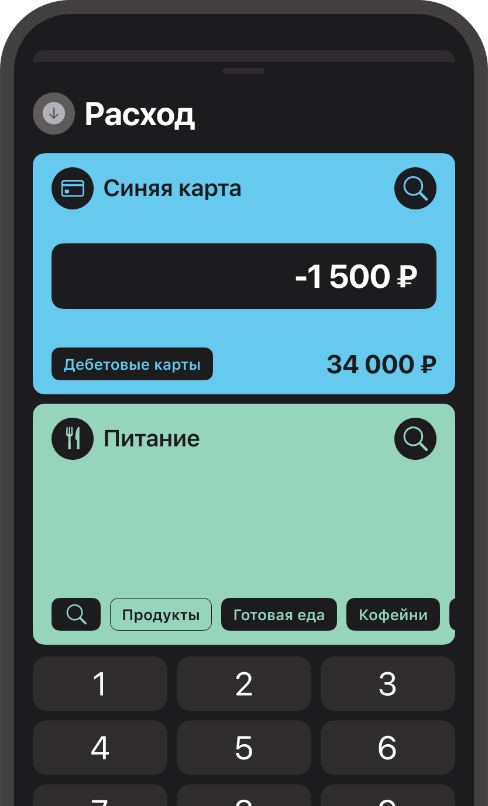Создавайте операции простыми жестами — расход, доход или перевод. Все действия мгновенно отражаются в отчётах и пересчитываются в актуальные показатели.