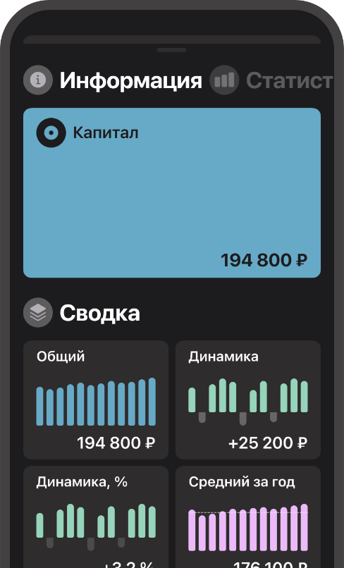 Анализируйте свои финансы с помощью детальных графиков, фильтров и статистики. Сравнивайте расходы, доходы и прибыль за разные периоды и отслеживайте динамику своего капитала.