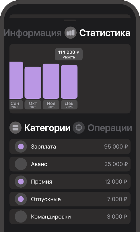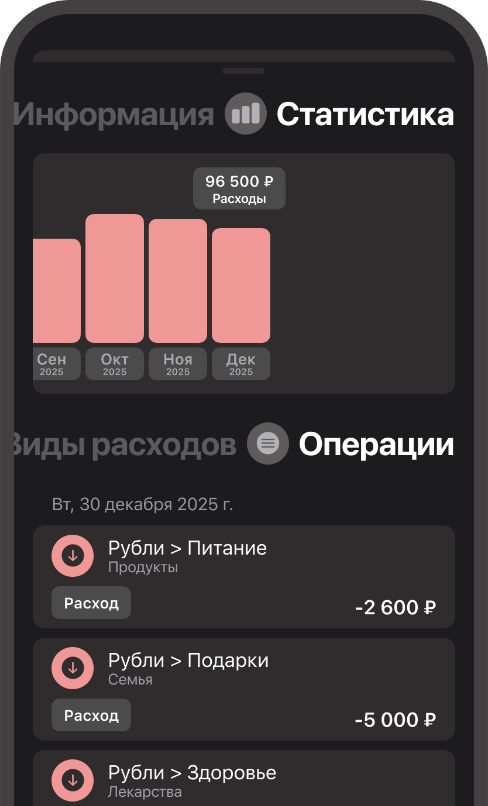 Отслеживайте расходы по видам и категориям — от повседневных покупок до крупных платежей. Анализируйте структуру трат и контролируйте, куда уходят ваши деньги.