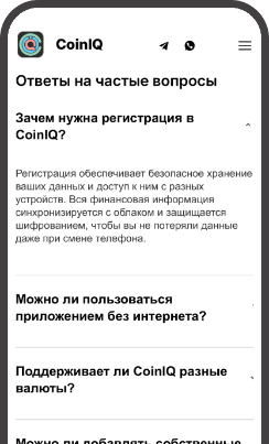 Наша миссия — освободить пользователя от хаоса в цифрах и дать ему инструмент, который объединяет всё: наличные, счета, расходы, доходы и капитал. CoinIQ помогает видеть полную картину финансов и принимать осознанные решения каждый день.